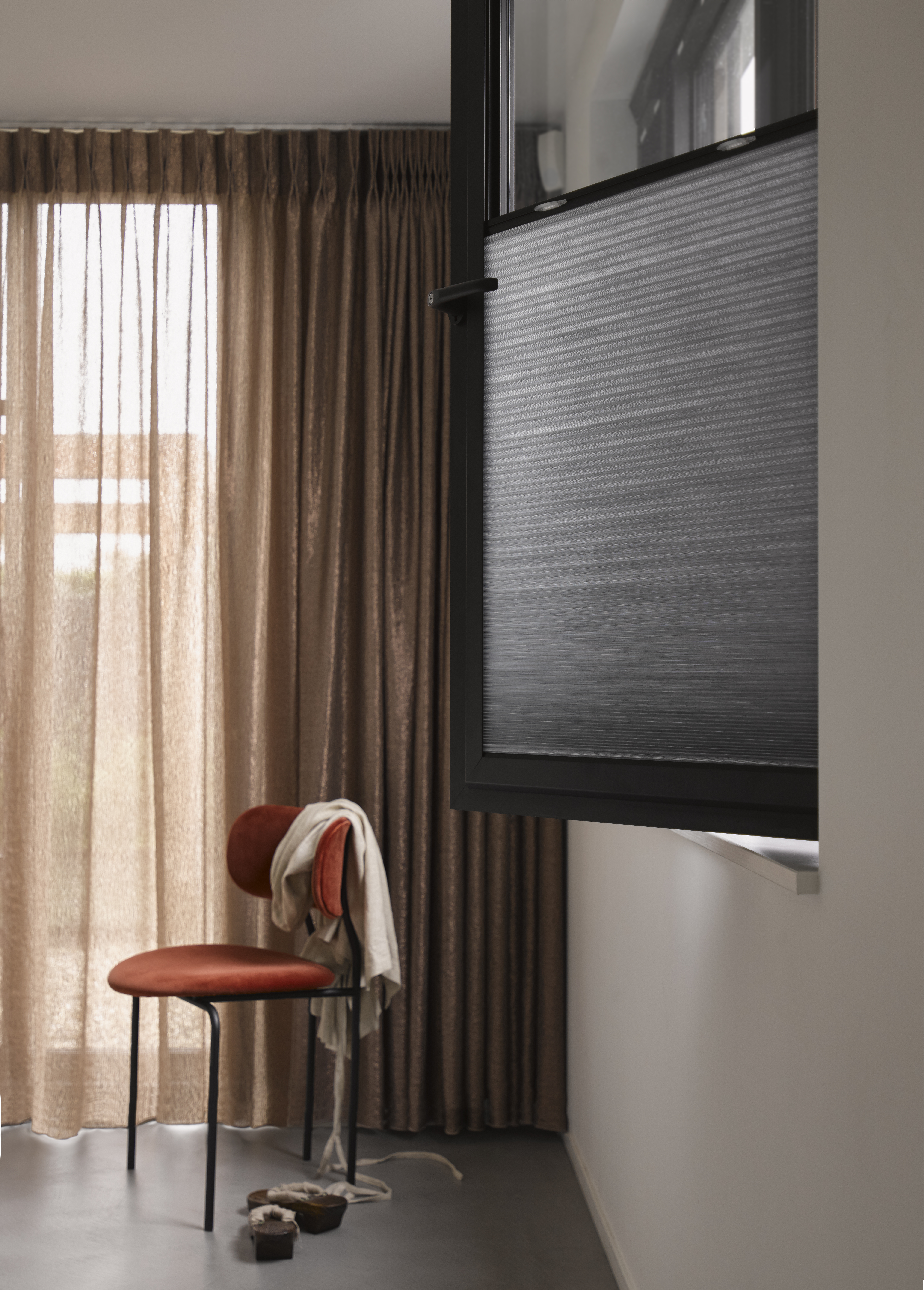 De bediening is eenvoudig en gebruiksvriendelijk. Met een handgreep schuif je de raamdecoratie soepel omhoog of omlaag, terwijl je bij de jaloezieën de lamellen met een tuimelstang in de gewenste stand zet. Combineer je twee stoffen in één frame? Dan heb je voor elke stof een aparte handgreep, zodat je de lichtinval en sfeer volledig naar wens kunt afstemmen.