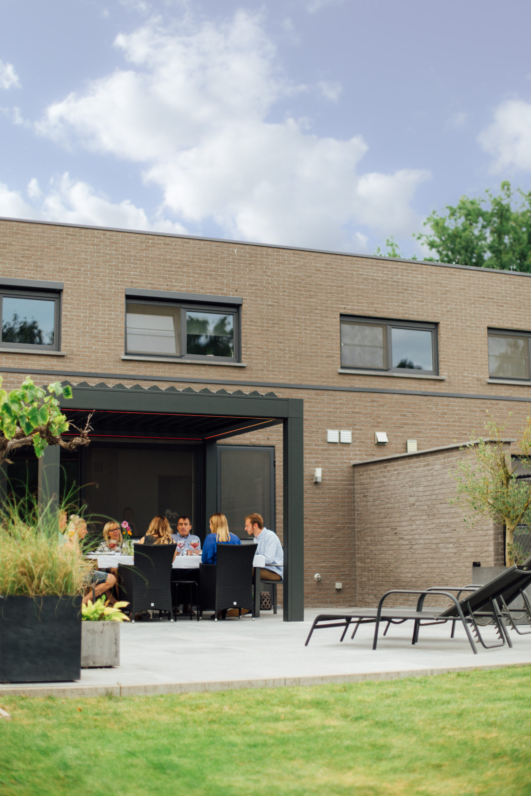 De brede lamellen zijn elektrisch verstelbaar en geven je de vrijheid om zelf te spelen met zon, schaduw en ventilatie. Bij regen voert het slimme afwateringssysteem het water geruisloos via de palen af, zodat je nooit last hebt van nattigheid. Of je nu kiest voor een vrijstaande uitvoering in de tuin, een strakke aanbouw tegen de gevel of een inbouwoplossing: de Opera past zich moeiteloos aan jouw woning aan.
