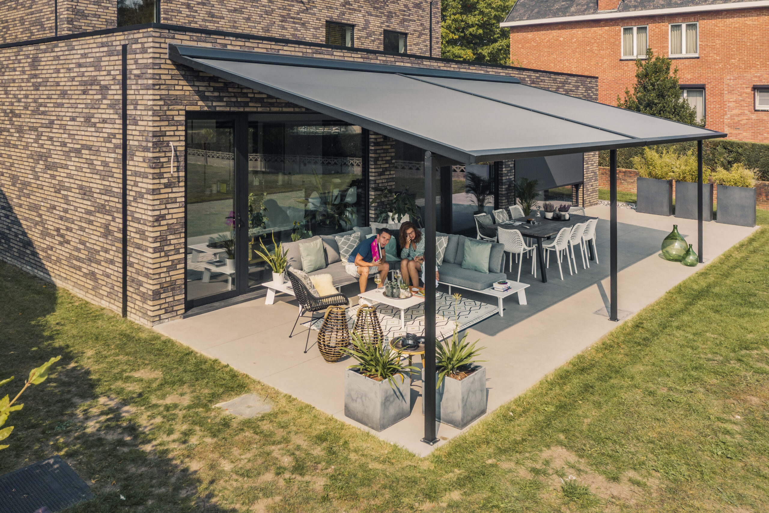De Linea combineert dezelfde voordelen als de Versuz: een robuuste constructie, slanke palen en een strak gespannen doek dat bestand is tegen zon, regen en wind. Maar door de horizontale uitvoering krijgt je terras een andere beleving – open, licht en eigentijds – alsof je een stijlvolle buitenkamer toevoegt aan je woning.